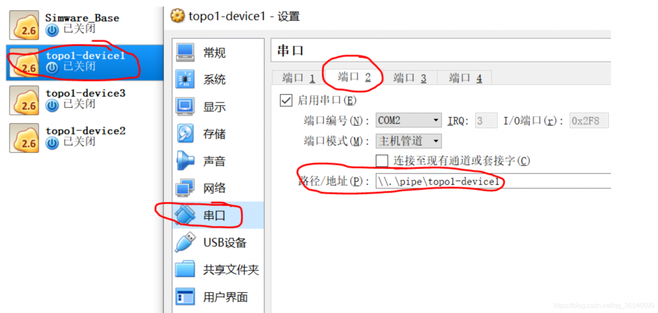 选中左侧其中某一台机器,右键-->设置-->串口-->端口2;复制路径/地址的内容