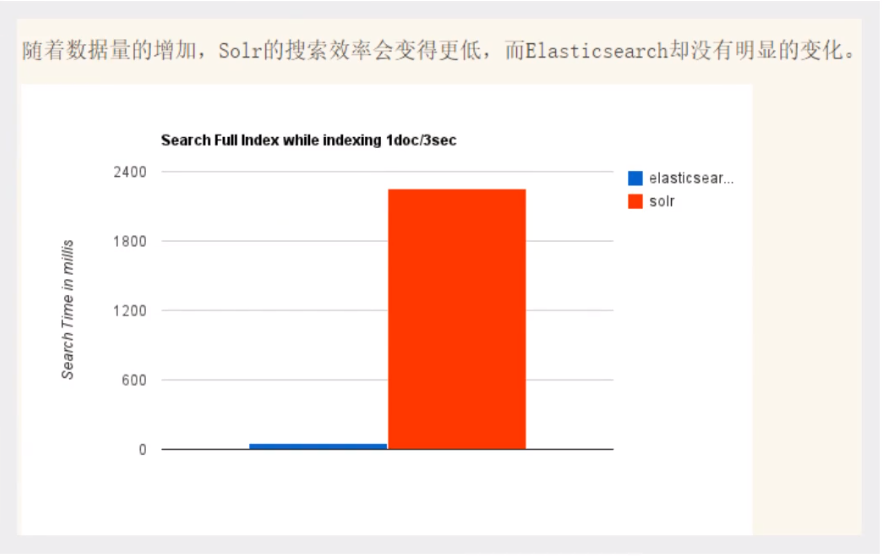 随着数据量的增加,Solr的搜索效率会变得更低,而ElasticSearch却没有明显的变化