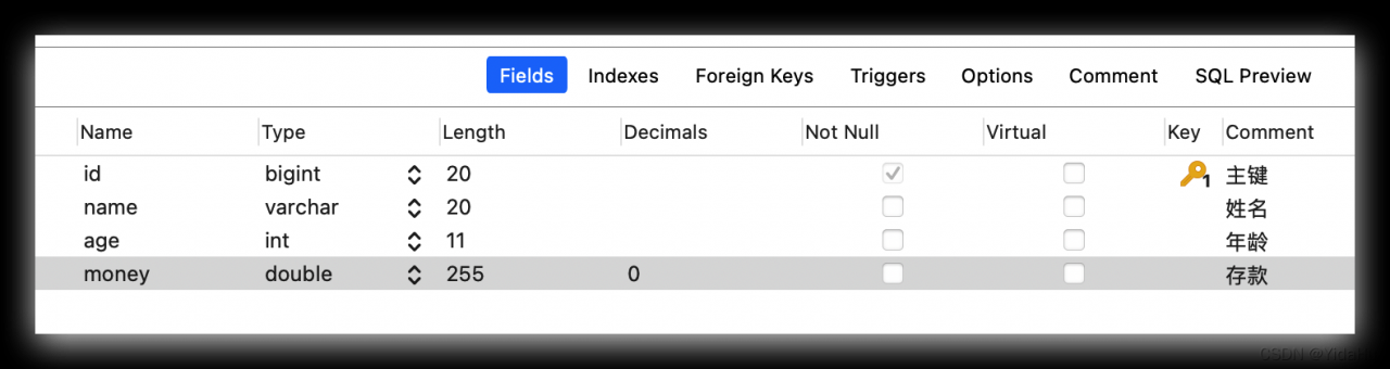 `money` double(255,0) DEFAULT NULL COMMENT '存款',
