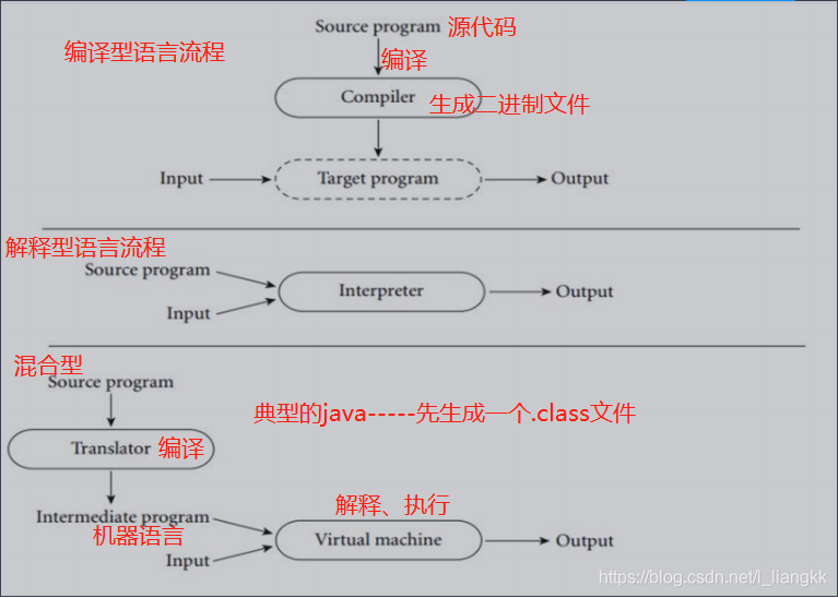 解释 : 高级语言-->执行-->解释器-->机器代码 ,如: shell , python , php , JavaScript , perl