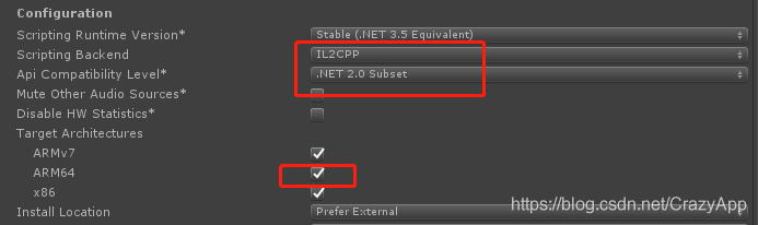 2.在Player Setting中Other Setting的一些设置。使用谷歌的新格式AAB文件提交的时候需要支持64位的,下面要选择IL2CPP,然后勾上ARM64。使用IL2CPP,需要NDK。这个可以再unity中根据提示进行下载。