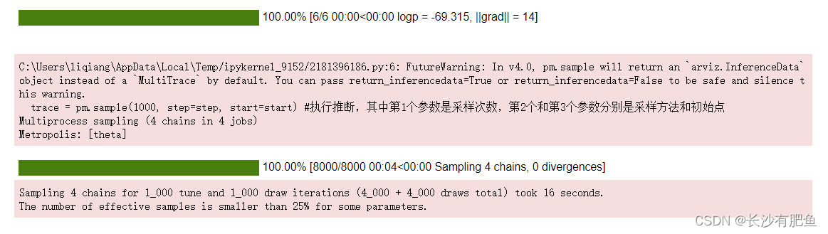 with pm.Model() as our_first_model: #构建了一个模型的容器,PyMC3使用with语法将所有位于该语法块内的代码都指向同一个模型 theta = pm.Beta('theta', alpha=1, beta=1) #指定先验 y = pm.Bernoulli('y', p=theta, observed=data) #用跟先验相同的语法描述了似然,唯一不同的是我们用observed变量传递了观测到的数据 start = pm.find_MAP() #返回最大后验(Maximum a Posteriori,MAP),为采样方法提供一个初始点 step = pm.Metropolis() #定义了采样方法,Metropolis-Hastings算法,其实PyMC3也会根据不同参数的特性自动地赋予一个采样器 trace = pm.sample(1000, step=step, start=start) #执行推断,其中第1个参数是采样次数,第2个和第3个参数分别是采样方法和初始点