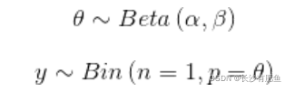 现在有了数据,需要再指定模型。回想一下,模型可以通过指定似然和先验的概率分布完成。对于似然,我们可以用二项分布来描述,对于先验,我们可以用参数为α=β=1的beta分布描述。这个beta分布与[0,1]区间内的均匀分布是一样的。我们可以用数学表达式描述如下: