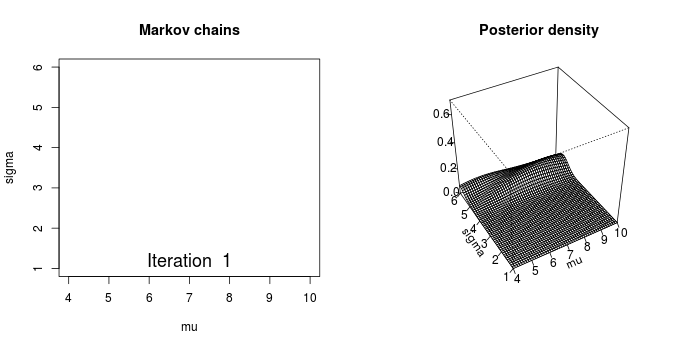 上面的动画很好的演示了马尔科夫链蒙特卡罗方法(MCMC)的过程。MCMC采样器从先验分布中选取参数值,计算从这些参数值决定的某个分布中得到观测数据的可能性。