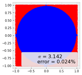 #每一次结果会不一样,样本越多必然也会越准确 N = 100000 x, y = np.random.uniform(-1, 1, size=(2, N)) inside = (x**2 + y**2)<= 1 pi = inside.sum()*4/N error = abs((pi - np.pi)/pi)* 100 outside = np.invert(inside) plt.plot(x[inside], y[inside], 'b.') plt.plot(x[outside], y[outside], 'r.') plt.plot(0, 0, label='$\hat \pi$ = {:4.3f}\nerror = {:4.3f}%'. format(pi, error), alpha=0) plt.axis('square') plt.legend(frameon=True, framealpha=0.9, fontsize=16);