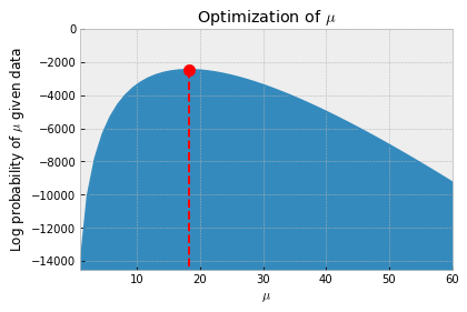 x = np.linspace(1, 60) y_min = np.min([poisson_logprob(i, sign=1) for i in x]) y_max = np.max([poisson_logprob(i, sign=1) for i in x]) fig = plt.figure(figsize=(6,4)) _ = plt.plot(x, [poisson_logprob(i, sign=1) for i in x]) _ = plt.fill_between(x, [poisson_logprob(i, sign=1) for i in x], y_min, color=colors[0], alpha=1) _ = plt.title('Optimization of $\mu$') _ = plt.xlabel('$\mu$') _ = plt.ylabel('Log probability of $\mu$ given data') _ = plt.vlines(freq_results['x'], y_max, y_min, colors='red', linestyles='dashed') _ = plt.scatter(freq_results['x'], y_max, s=110, c='red', zorder=3) _ = plt.ylim(ymin=y_min, ymax=0) _ = plt.xlim(xmin=1, xmax=60)
