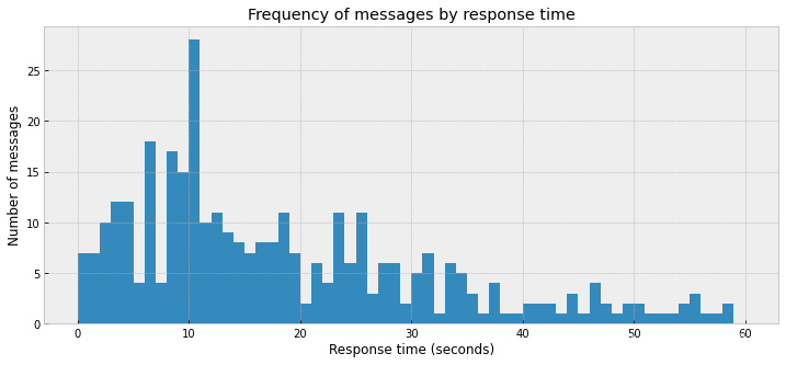 fig = plt.figure(figsize=(12,5)) _ = plt.title('Frequency of messages by response time') _ = plt.xlabel('Response time (seconds)') _ = plt.ylabel('Number of messages') _ = plt.hist(messages['time_delay_seconds'].values, range=[0, 60], bins=60, histtype='stepfilled')