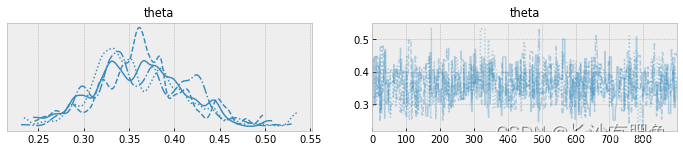 burnin = 100 chain = trace[burnin:] pm.traceplot(chain, lines={'theta':theta_real});
