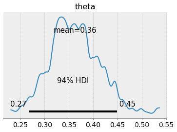 直观上,一个明智的做法是将HPD区间与我们感兴趣的值进行比较,在我们的例子中,该值是0.5。前面的图中可以看出HPD的范围是0.264~0.457,没有包含0.5这个值,裁定一个硬币是不公平的。