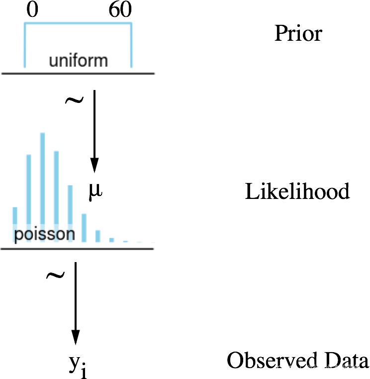 - 这个泊松分布有一个参数 ? 我们知道它是在 0 到 60 (Prior)