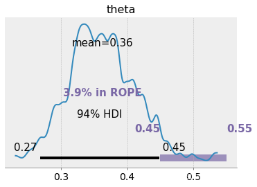 pm.plot_posterior(chain, rope=[0.45, 0.55])