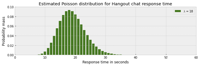 fig = plt.figure(figsize=(11,3)) ax = fig.add_subplot(111) x_lim = 60 mu = np.int(freq_results['x']) for i in np.arange(x_lim): plt.bar(i, stats.poisson.pmf(mu, i), color=colors[3]) _ = ax.set_xlim(0, x_lim) _ = ax.set_ylim(0, 0.1) _ = ax.set_xlabel('Response time in seconds') _ = ax.set_ylabel('Probability mass') _ = ax.set_title('Estimated Poisson distribution for Hangout chat response time') _ = plt.legend(['$\lambda$ = %s' % mu])