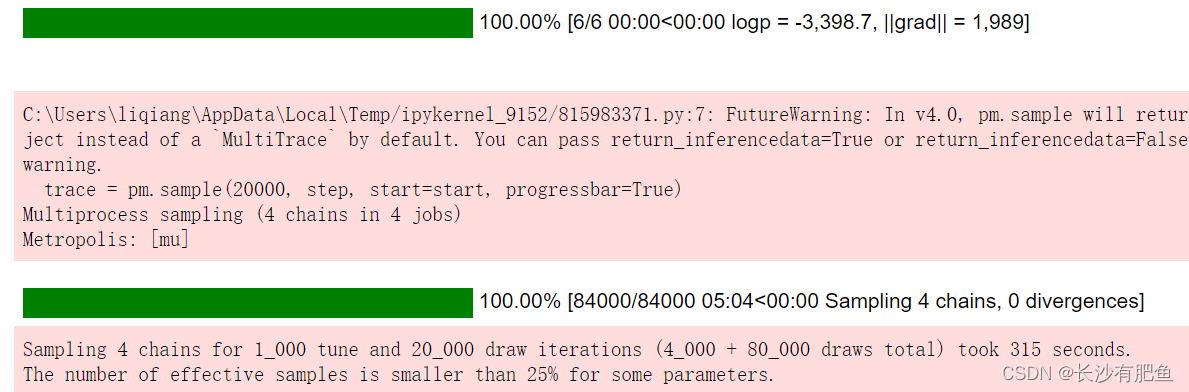 一个有自相关性的采样要比没有自相关性的采样所包含的信息量更少,因此,给定采样大小和采样的自相关性之后,我们可以尝试估计出该采样的大小为多少时,该采样没有自相关性而且包含的信息量不变,该值称为有效采样大小。理想情况下,两个值是一模一样的;二者越接近,我们的采样效率越高。有效采样大小可以作为我们的一个参考,如果我们想要估计出一个分布的均值,我们需要的最小采样数至少为100;如果想要估计出依赖于尾部分布的量,比如可信区间的边界,那么我们可能需要1000到10000次采样。