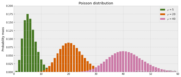 fig = plt.figure(figsize=(12,5)) ax = fig.add_subplot(111) x_lim = 60 mu = [5, 20, 40] for i in np.arange(x_lim): plt.bar(i, stats.poisson.pmf(mu[0], i), color=colors[3]) plt.bar(i, stats.poisson.pmf(mu[1], i), color=colors[4]) plt.bar(i, stats.poisson.pmf(mu[2], i), color=colors[5]) _ = ax.set_xlim(0, x_lim) _ = ax.set_ylim(0, 0.2) _ = ax.set_ylabel('Probability mass') _ = ax.set_title('Poisson distribution') _ = plt.legend(['$\mu$ = %s' % mu[0], '$\mu$ = %s' % mu[1], '$\mu$ = %s' % mu[2]])