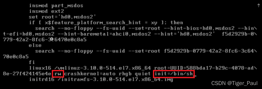 3.这个时候需要我们输入我们设置的进入gurb的用户名和密码进入grub(看到这个界面说明我们已经设置grub加密生效了) ,输入正确后会进入到以下的界面,编辑修改两处:ro改为rw, 以及在该行的最后面添加init=/bin/sh