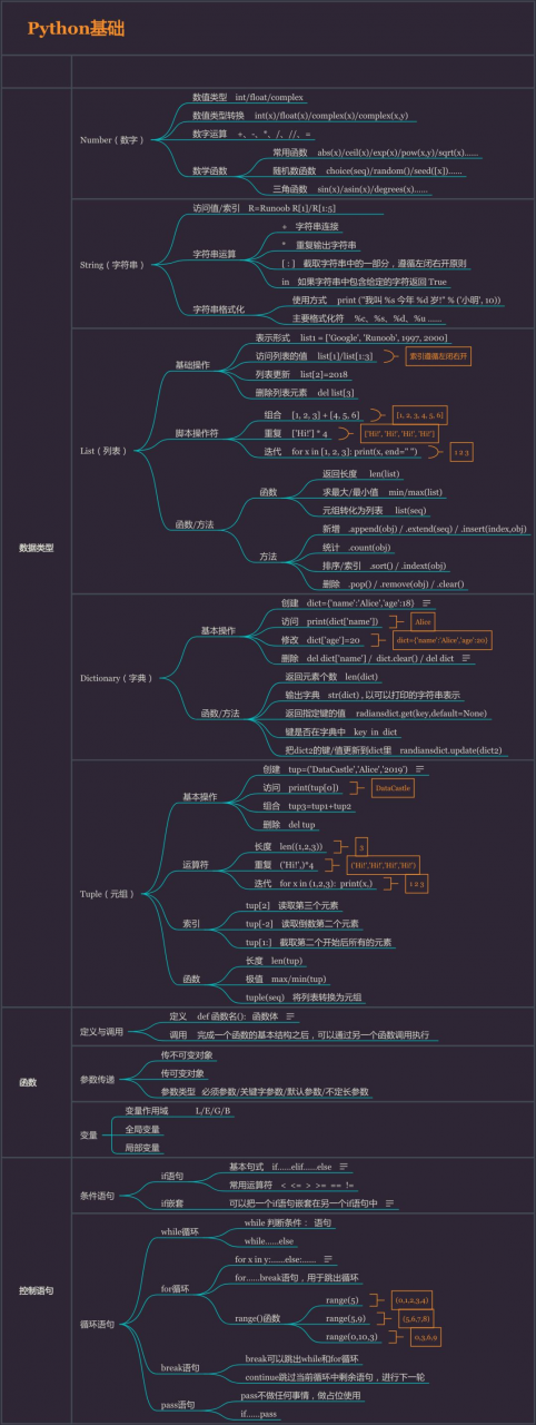 ·基本的数据类型:比如字符串、列表、字典、元组,不同的数据类型如何创建、进行增、删、改等操作,以及其中常用的函数及方法;