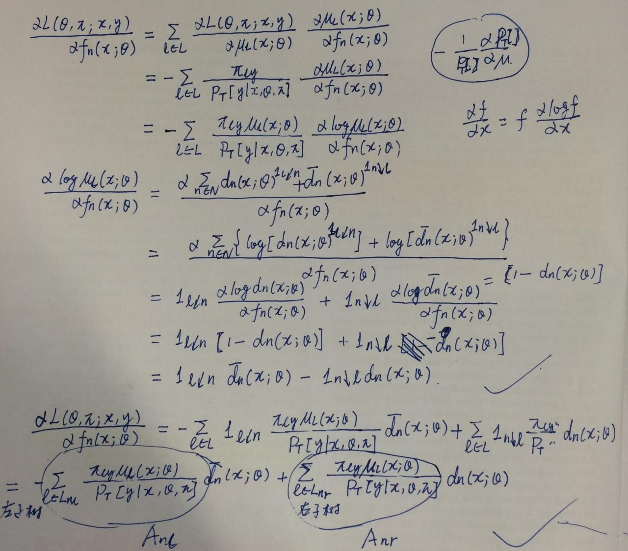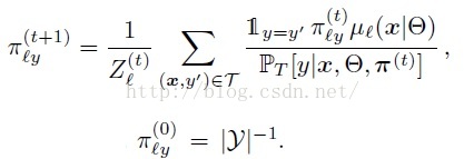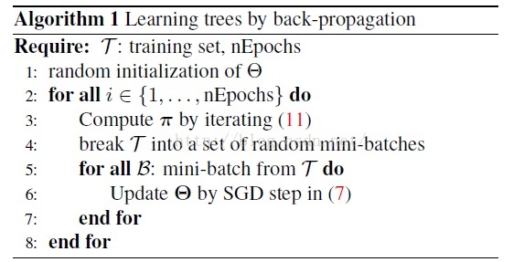 本篇论文采用交替迭代的方法,依次更新决策函数的参数和叶子节点分布函数,以上内容是对决策函数参数的迭代,对叶子节点分布函数的迭代如下: