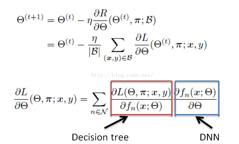 本篇论文的反向传播分为两个部分,第一部分是决策树的反向传播,第二部分是DNN的反向传播,紧跟在决策树后面,DNN的反向传播大家都很清楚。下面我们重点说一下本篇论文决策树如何反向传播?