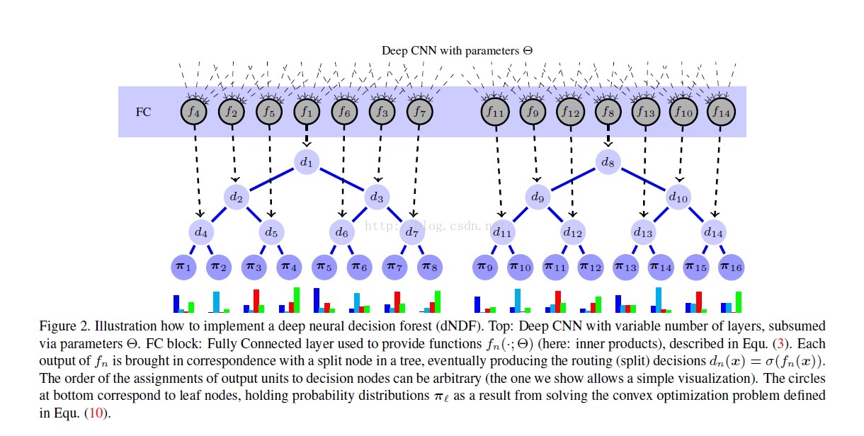 预备知识:由图可知,每个分离节点(split nodes)的参数由DNN来学习(representation learning),DNN最后一层是全连接层,每个节点单元的输出作为分离节点决策函数(d1,d2,...)的输入参数,本篇论文采用的决策函数是sigmoid函数。知道决策函数后,我们可以计算其路径函数(routing function),每棵树的根节点,其路径函数的值赋予1,然后乘以该节点的决策函数值d,得到左边子节点的路径函数1*d,右边子节点的路径函数值为1*(1-d),以此类推,可以计算出每颗决策树节点的路径函数。