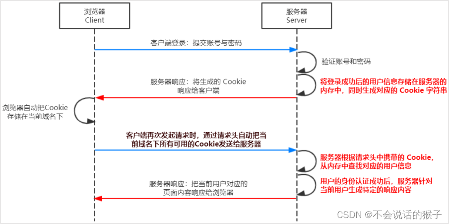 注意: 当前端请求后端接口不存在跨域问题的时候,推荐使用 Session 身份认证机制。 当前端需要跨域请求后端接口的时候,不推荐使用 Session 身份认证机制,推荐使用 JWT 认证机制。