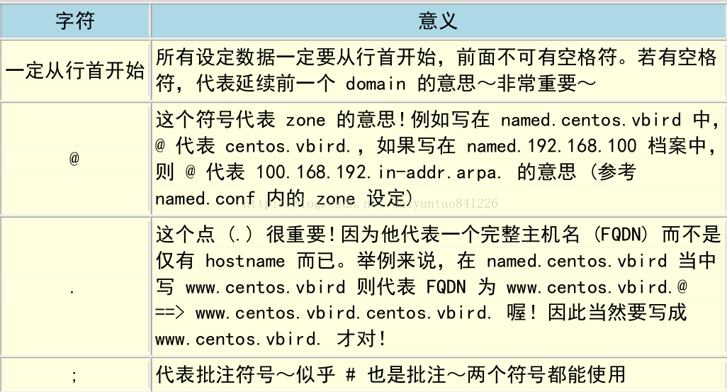 正解的设定权以及 DNS 正解 zone 记录的标志: 因为国际INTERNIC 已经定义出 gTLD 以及 ccTLD 了,所以你不能自定义例如 centos.vbird 这种网域,还是要符合上层DNS给予