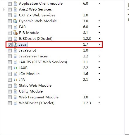 6、选择java版本为1.7,并去掉其他两项,如下图: