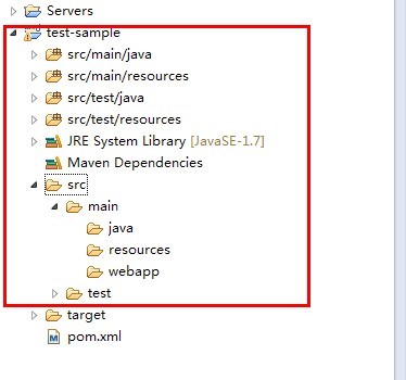 4、完成maven项目的创建,生成相应的maven项目结果,如下所示,此处有部分结构是项目不需要的,我们需要去掉: