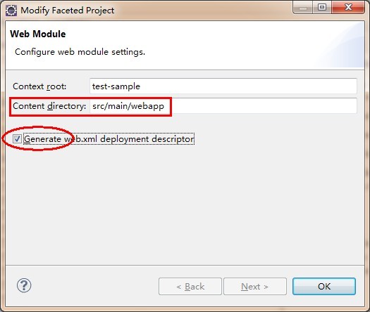 10、配置src/main/webapp,并勾选生成web.xml的选项,如下: