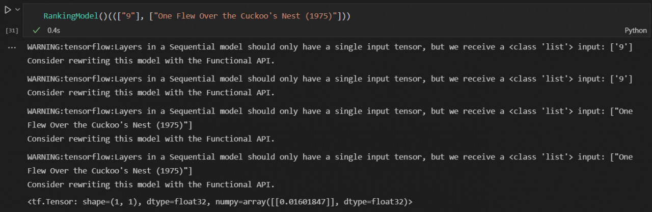 由下图所示,用未经过训练的模型为用户号为9推荐电影《One Flew Over the Cuckoo's Nest (1975)》,预测的可能性为0.016: