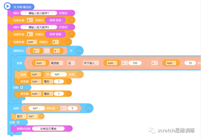 具体程序如上图,基本满足了题目需求。编程猫的质数判断很简单,直接可以使用积木块;回文数判断因为只是测试3位数,所以判断百位数和个位数相等就可以了。