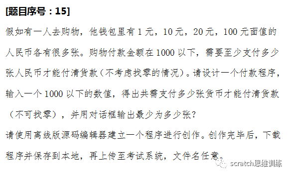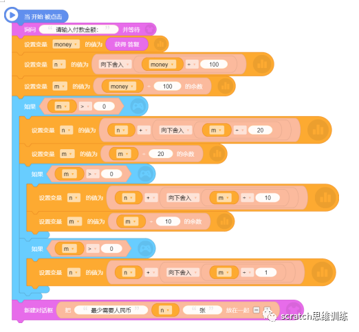 答案程序如上图,将付款金额依次用若干张100元、20元、10元和1元凑够后,再得出总的张数即可。