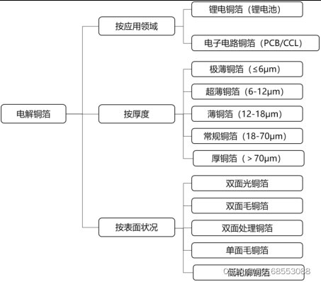 电解铜箔是现代电子行业不可替代的基础材料,被称为电子产品信号与电力传输、沟通的“神经网络”。根据应用领域的不同,电解铜箔可以分为应用于印制电路板的电子电路铜箔,以及应用于锂电池的锂电铜箔;根据铜箔厚度不同,按照通行标准可以分为极薄铜箔(≤6μm)、超薄铜箔(6-12μm)、薄铜箔(12-18μm)、常规铜箔(18-70μm)和厚铜箔(>70μm);根据表面状况不同可以分为双面光铜箔、双面毛铜箔、双面处理铜箔、单面毛铜箔和低轮廓铜箔(RTF铜箔、VLP铜箔、HVLP铜箔)等。