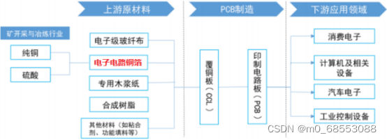 (5)电子电路铜箔产业链分析:电子电路铜箔位于PCB产业链的上游,电子电路铜箔与电子级玻纤布、专用木浆纸、合成树脂等原材料经制备形成覆铜板(CCL),再经过一系列其他复杂工艺形成印制电路板(PCB),被广泛应用于通信、消费电子、计算机及相关设备、汽车电子和工业控制设备产品中。电子电路铜箔的主要原材料为阴极铜,上游为铜矿开采与冶炼行业。