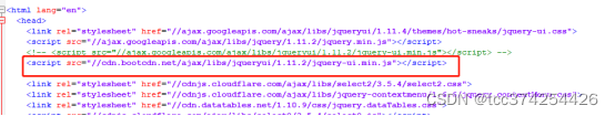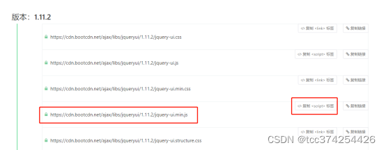 在bootcdn中搜索jqueryui关键字,找到对应1.11.2版本号的jquery-ui.min.js链接地址