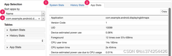 ②App Stats标签页包含有关特定应用的信息。使用左侧“App Selection”中的③可以对应用列表进行排序。使用④可以查看指定应用的统计信息。