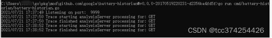 在路径F:\workspace\go\pkg\mod\github.com\google\battery-historian@v0.0.0-20170519220231-d2356ba4fd5f下,使用命令go run cmd/battery-historian/battery-historian.go运行battery-historian,默认端口号是9999