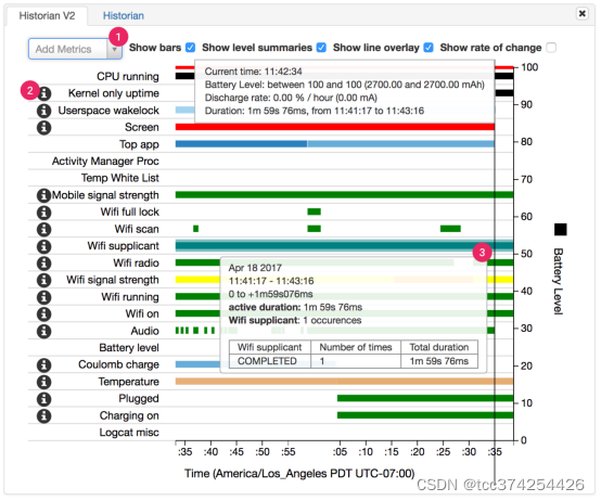 Battery Historian 图表会显示一段时间内与电源相关的事件