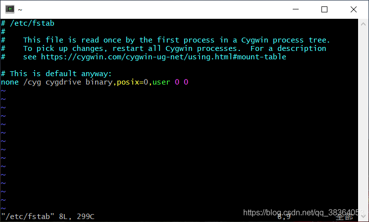 在/etc/fstab中将:“none/cygdrive cygdrive binary,posix=0,user 0 0” 改为 “none/cyg cygdrive binary,posix=0,user 0 0”。输入/cyg/c来代替/cygdrive/c来换一个不同的驱动器,这样会更短。它还删除了导致生成问题的posix acl语义,因为生成试图操作文件权限,并导致Windows文件系统出现大问题。