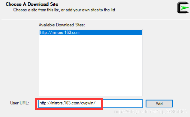 输入网易镜像,http://mirrors.163.com/cygwin/,再点击Add。最后