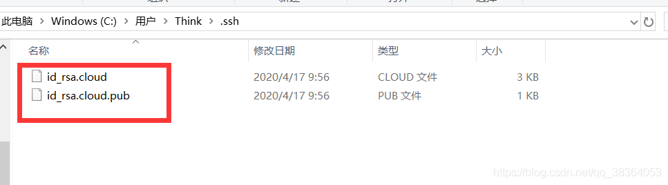 1.提示“C:\Users\Think\.ssh\id_rsa.cloud.pub (系统找不到指定的文件。)”,需要将生成的.ssh文件复制到windows用户目录下,再改变密钥文件名称,将id_rsa(私有密钥)改为id_rsa.cloud,将id_rsa.pub(公有密钥)改为id_rsa.cloud.pub。如下图: