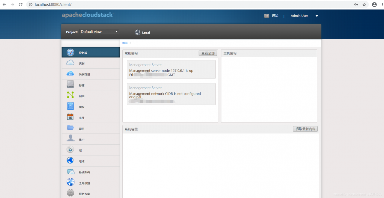 输入CloudStack初始的账户名(admin)和密码(password)。登录成功后,第一次登录成功会创建区域、提供点等。点击跳过直接进入首页如下: