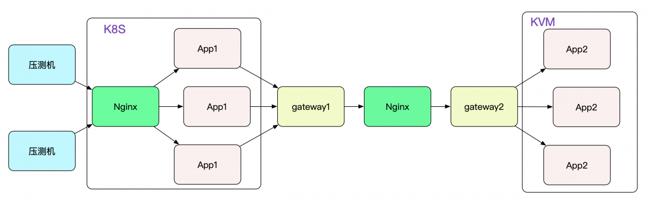 笔者要对自研的dubbo协议隧道网关进行压测(这个网关的设计也挺有意思,准备放到后面的博客里面)。先看下压测的拓扑吧: