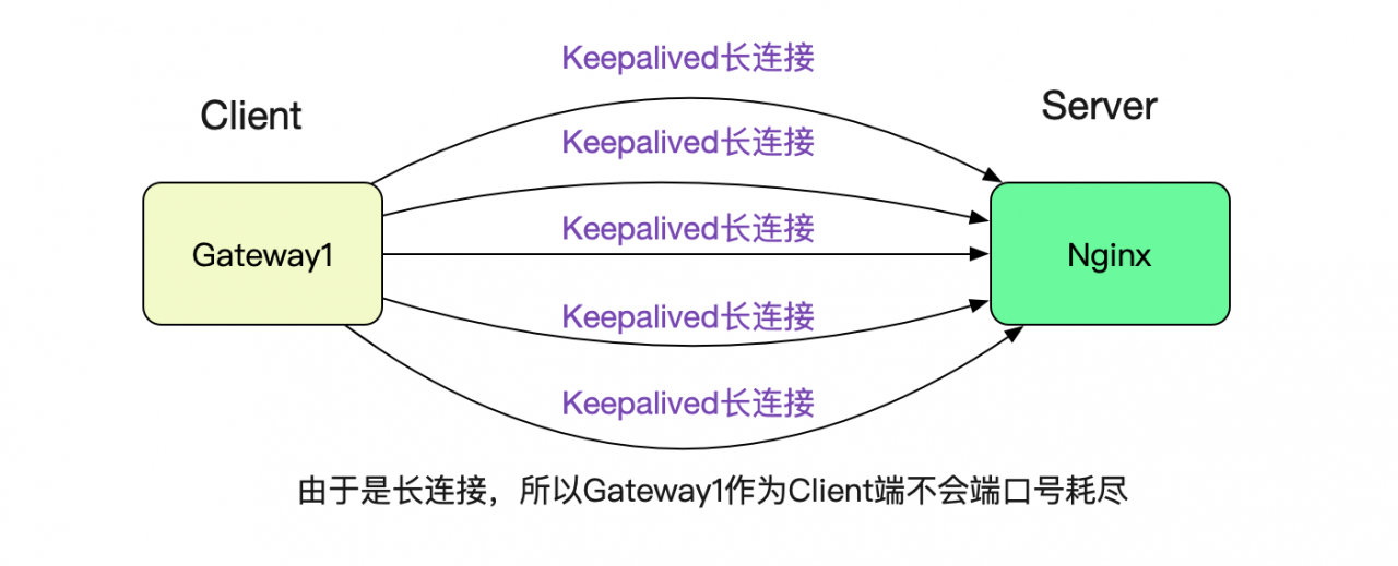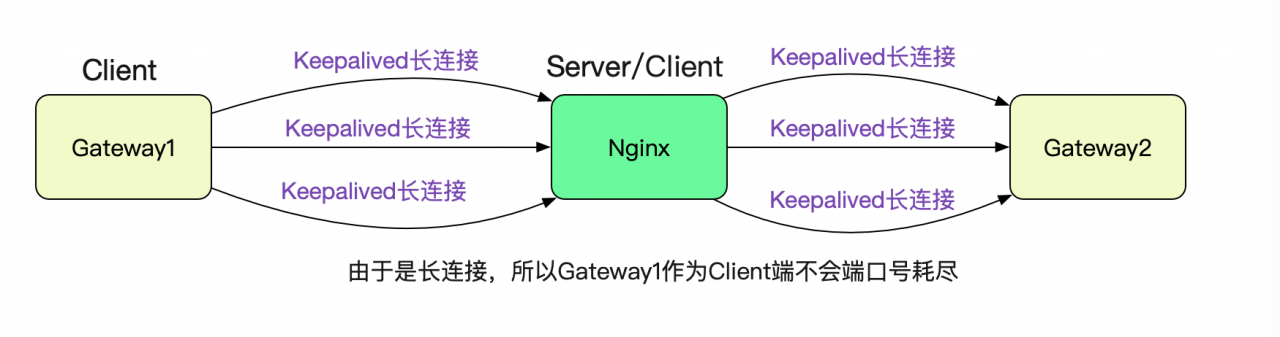 很简单,因为笔者在Gateway1调用Nginx的时候设置了Keepalived,所以采用的是长连接,就没有这个端口号耗尽的限制。