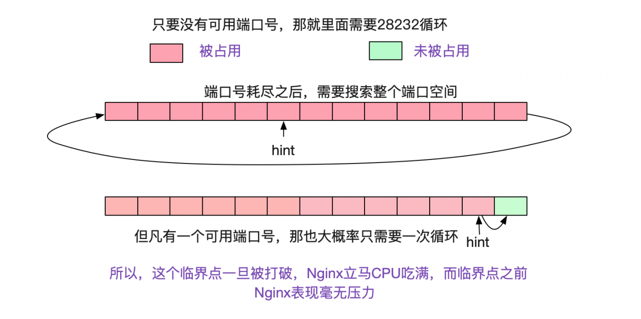 而笔者也很快想明白了Nginx为什么吃满了机器的CPU,问题就出来端口号的搜索过程。