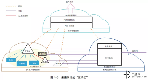 从运营商的角度来看,在全国连接终端有望超过 1000 亿的 5G 时代,一个云化的核心网络毫无疑问是必需的,但是怎么部署以及怎么划分是一个重要的问题。运营商普遍认为,在 SDN/NFV 的基础上,未来网络需要被划分为「三朵云」,如图 4–5 所示。