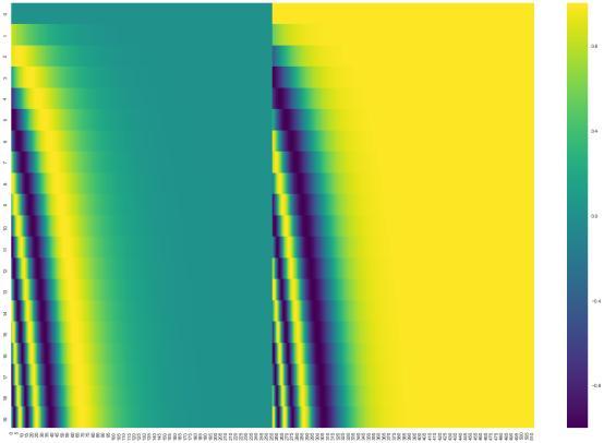 如果我们假设embedding的维数为4,则实际的位置编码则应如下图所示: