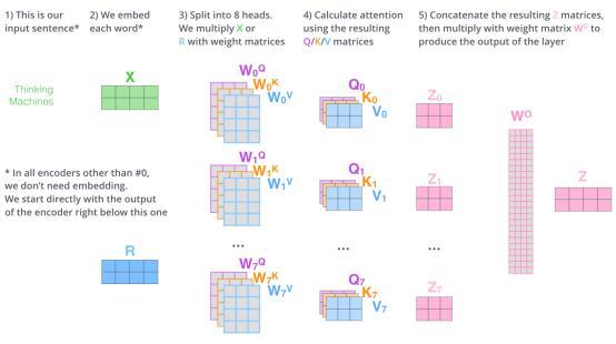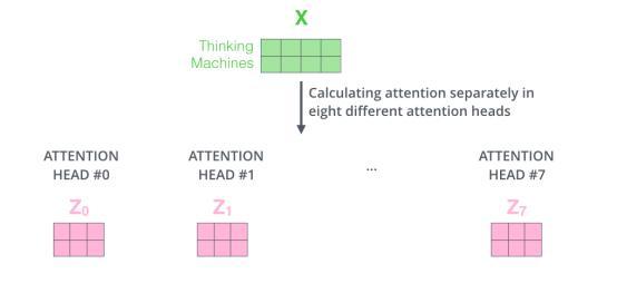 如果我们执行上面概述的自注意力计算,每次使用不同的权重矩阵,计算八次,我们最终将得到八个不同的Z矩阵。