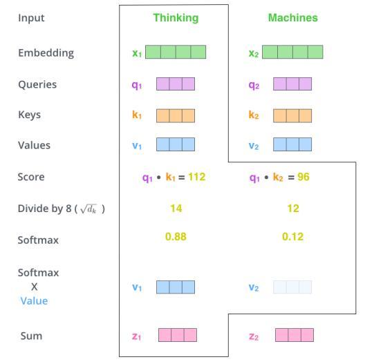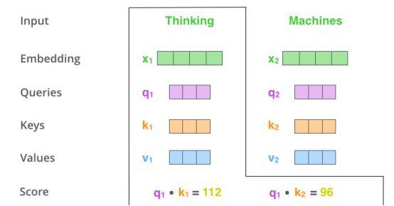 分数是通过将Query向量的点积与我们要评分的各个单词的Key向量相乘得出的。因此,如果我们正在处理位置#1上的单词的自注意,则第一个分数将是q1和k1的点积。第二个得分将是q1和k2的点积。