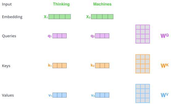 计算自注意力的第一步是依据每个编码器的输入向量(在这种情况下,是每个单词的embedding)创建三个向量。因此,对于每个单词,我们创建一个Query向量,一个Key向量和一个Value向量。通过将embedding乘以我们在训练过程中训练的三个矩阵来创建这些向量。