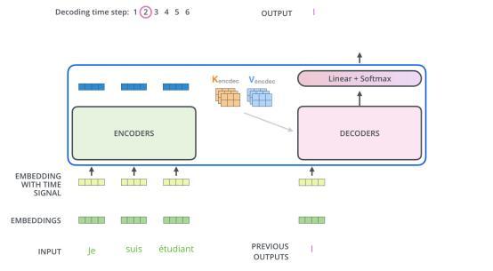 编码器首先处理输入序列。然后,顶部编码器的输出转换为注意力向量K和V的集合。每个解码器将在其“编码器-解码器注意力”层中使用它们,这有助于解码器将重心放在输入序列中合适的位置: